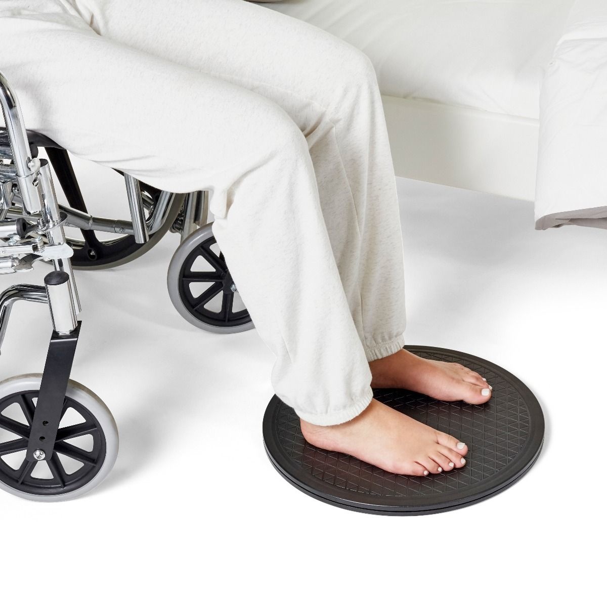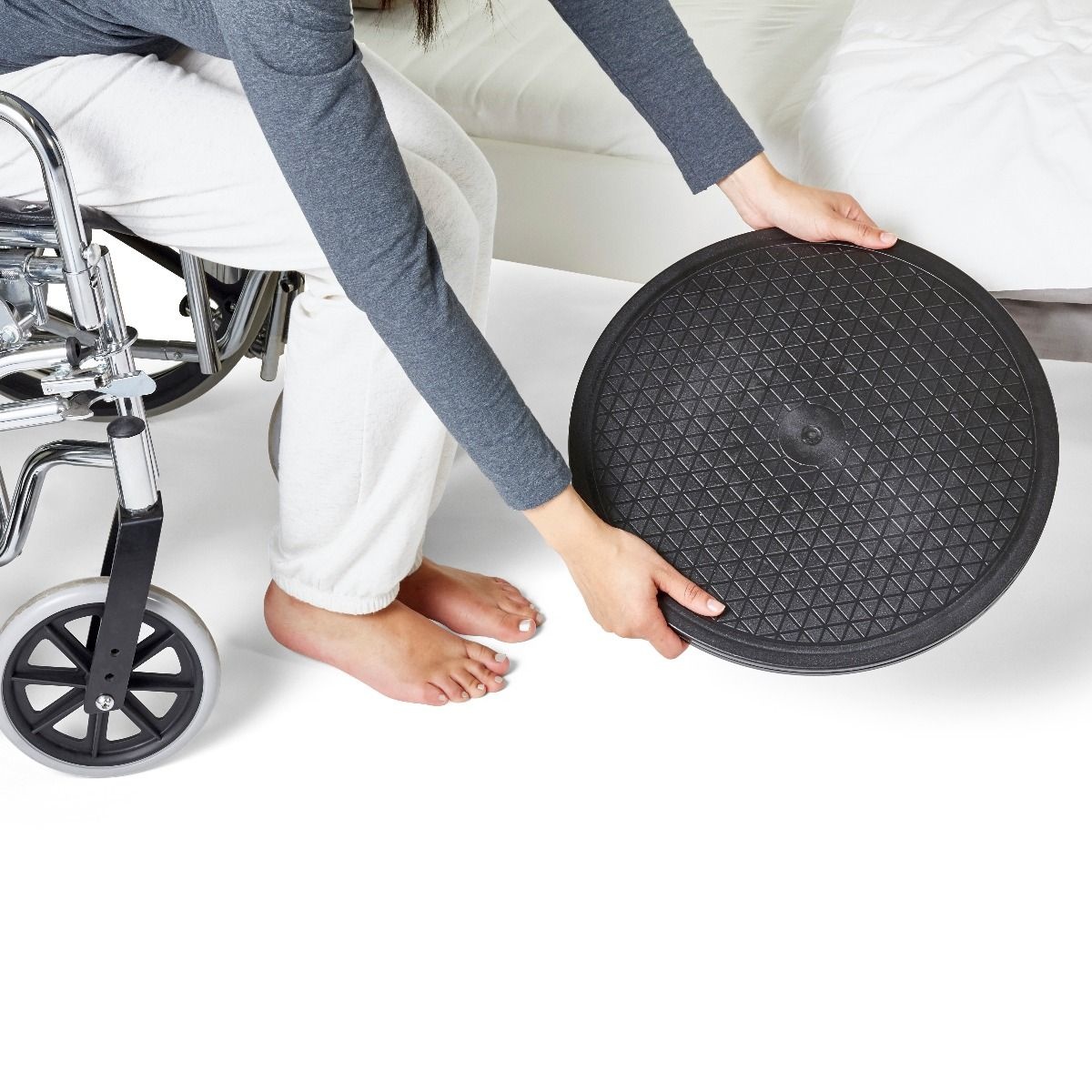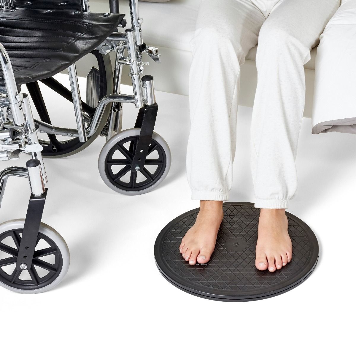 De draaischijf voor personen is een handig hulpmiddel om staand of zittend veilig te draaien, bijvoorbeeld van een stoel naar het bed of van de rolstoel naar de bank. Dankzij het stevige kunststof ontwerp draait de schijf soepel 360° in alle richtingen, wat het risico op overbelasting van rug of knieën vermindert.