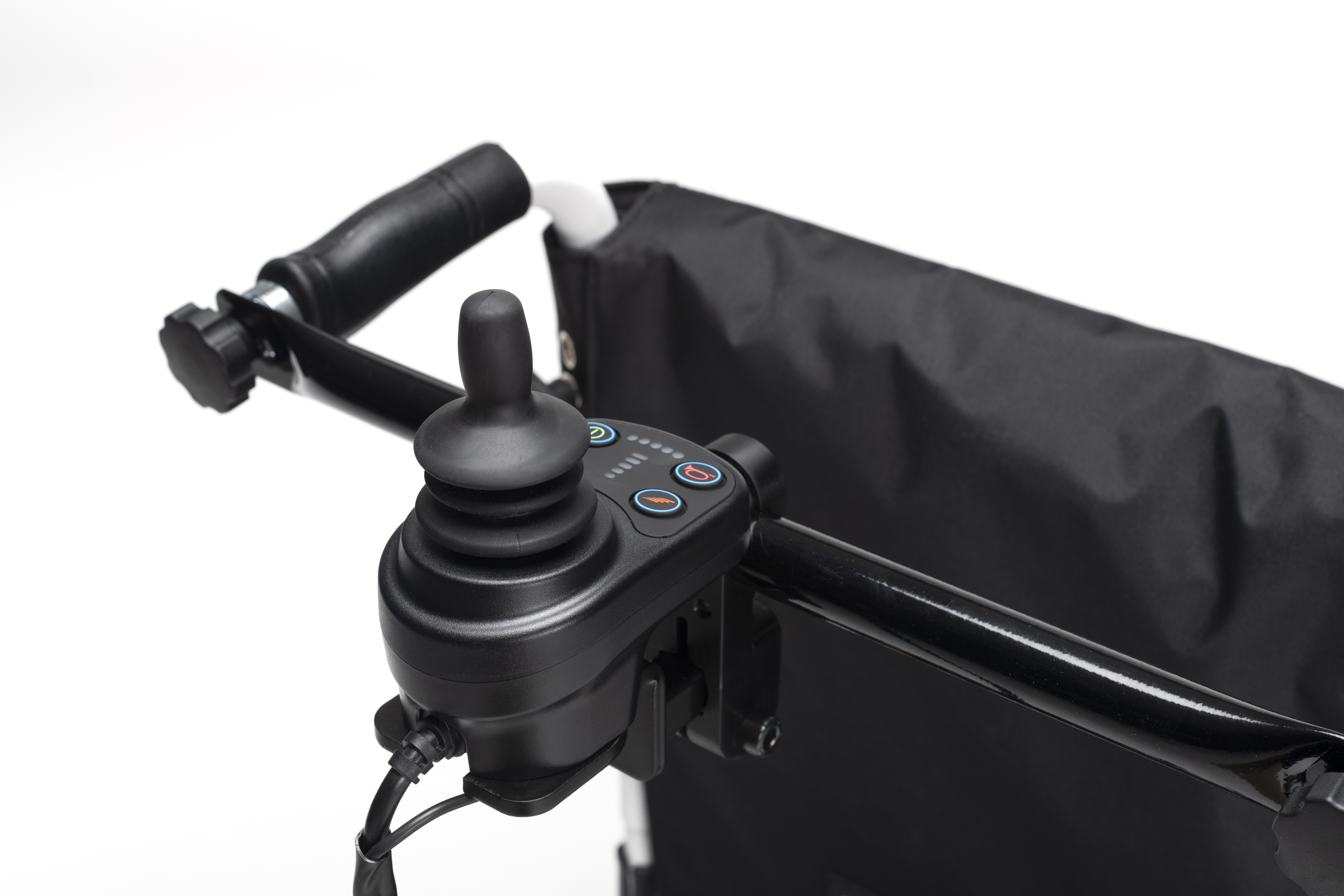 Met het bevestigingspunt voor de begeleidersbediening kunt u de joystick van voren naar achteren plaatsen en kan de begeleider aan de achterzijde de bediening van de rolstoel doen