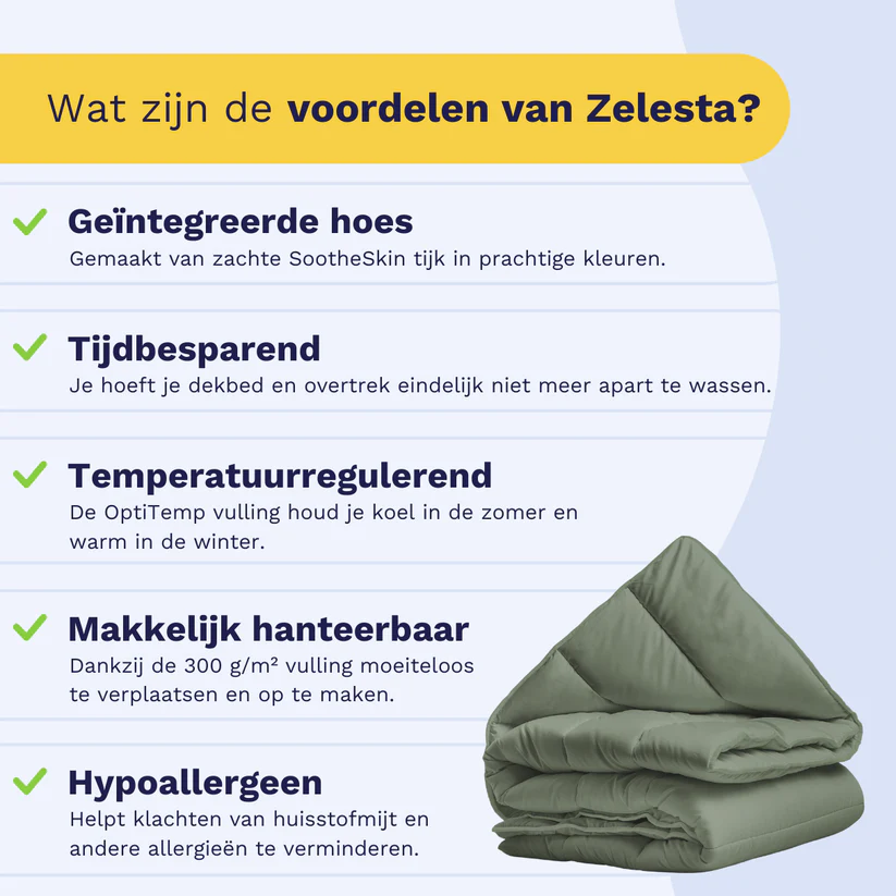 Wilt u het gemak van een hoesloos, wasbaar dekbed zelf ervaren? Kies dan voor de Zelesta RoyalBed Green  en geniet elke nacht van fris, hygiënisch en luxe slaapcomfort – het hele jaar door.